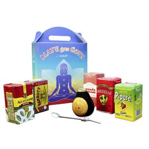 В наборе: матэ растворимый в пакетиках, сироп с матэ, матэ в пирамидках, термос и фляжка-бутылка для питья матэ